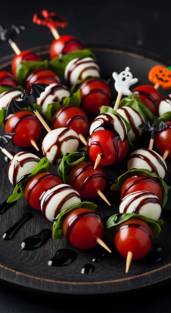- Drizzle balsamic glaze over the skewers for a “bloody” effect.